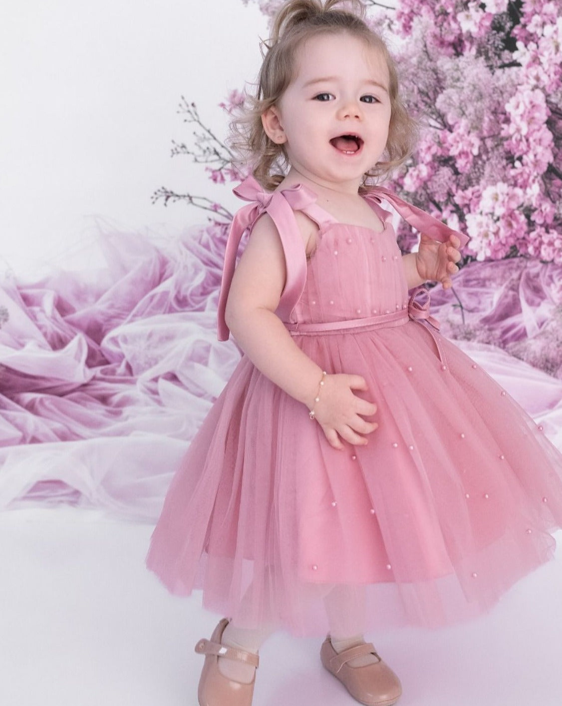 فستان حفلات للأطفال بشرائط ولؤلؤ