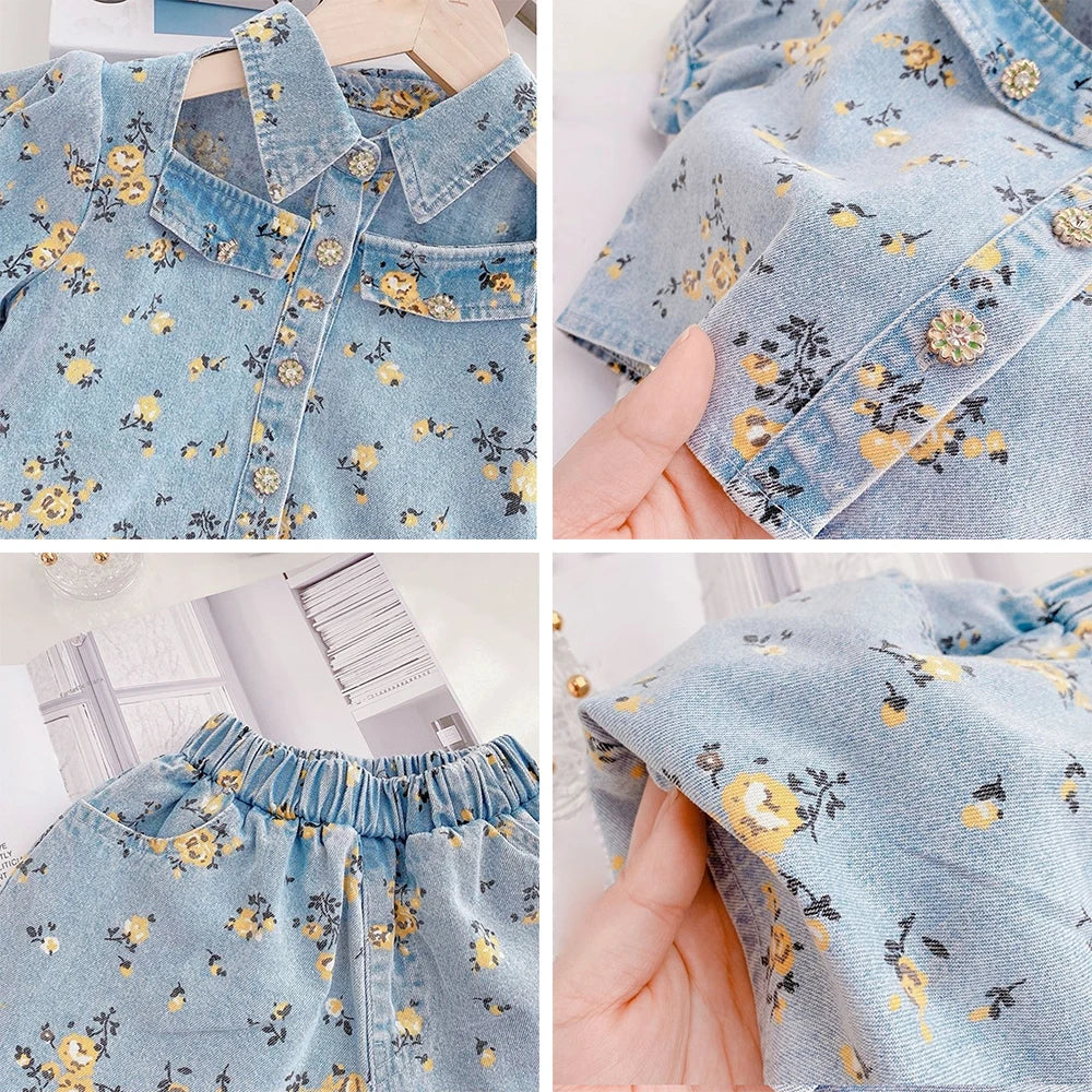 ✅الموديل: طقم جينز مزين بالزهور للبنات الرضع
