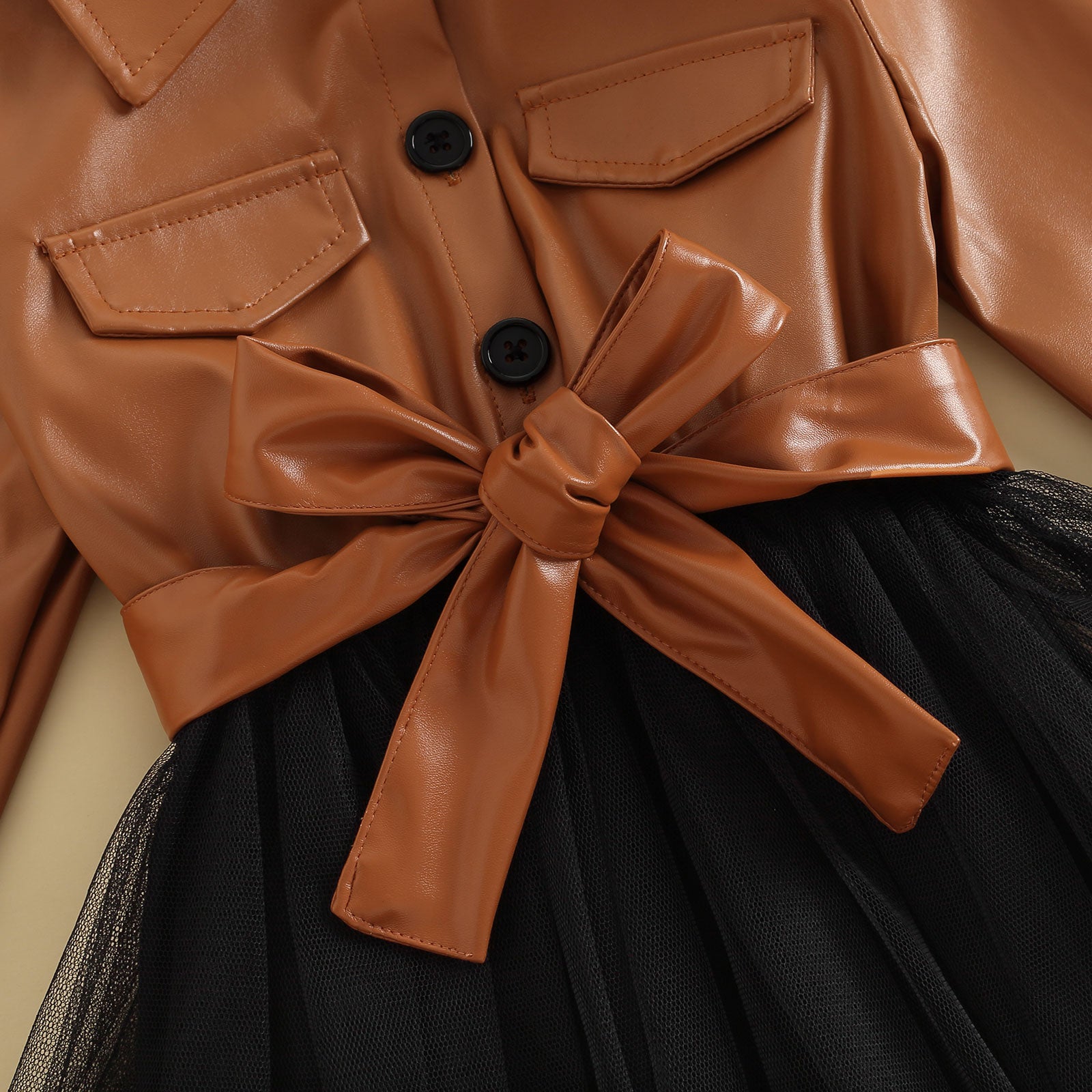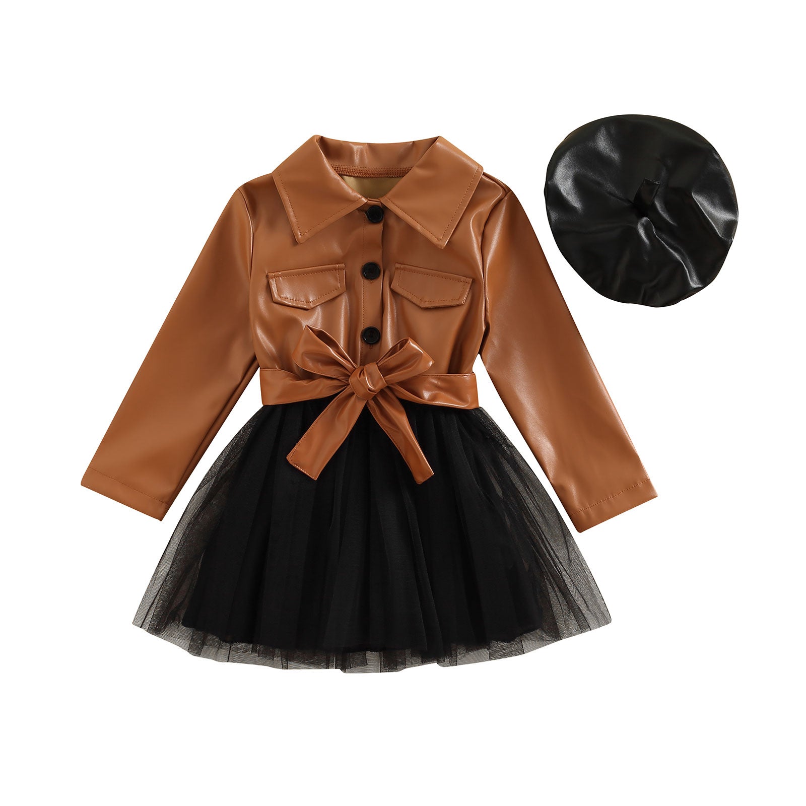 فستان أطفال من الجلد مع تنورة من الدانتيل وقبعة
