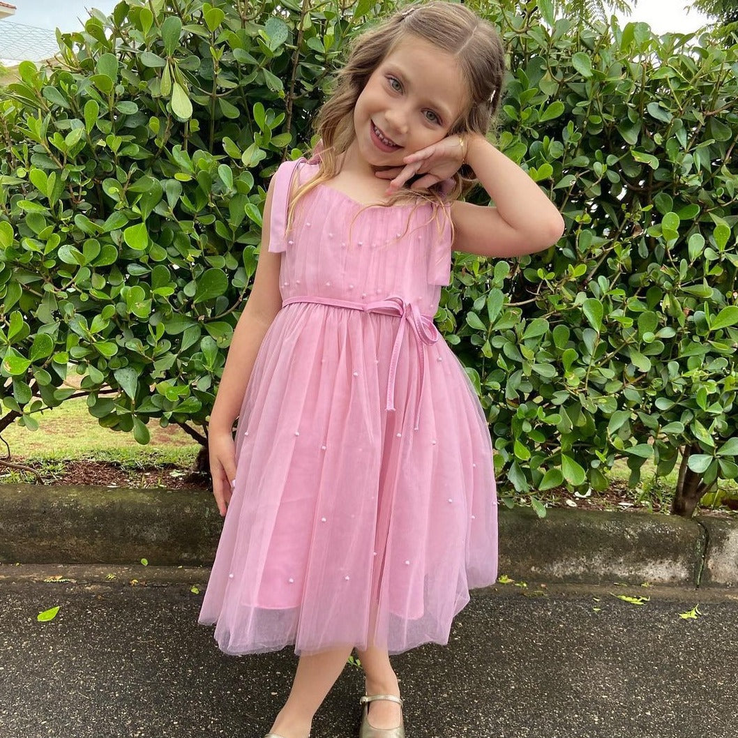 فستان حفلات للأطفال بشرائط ولؤلؤ