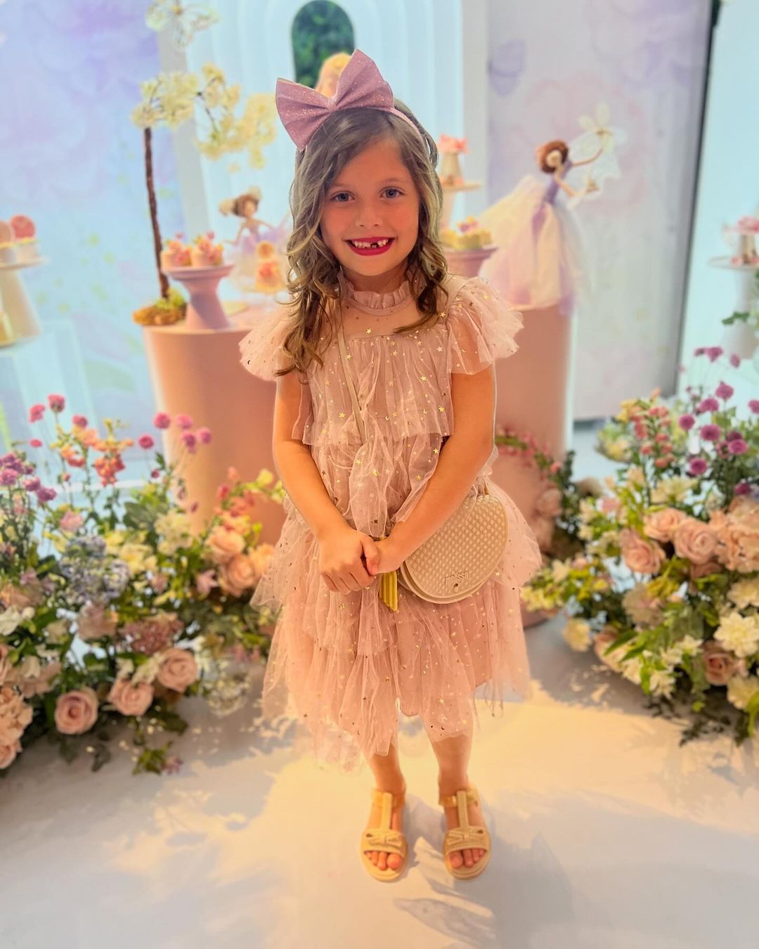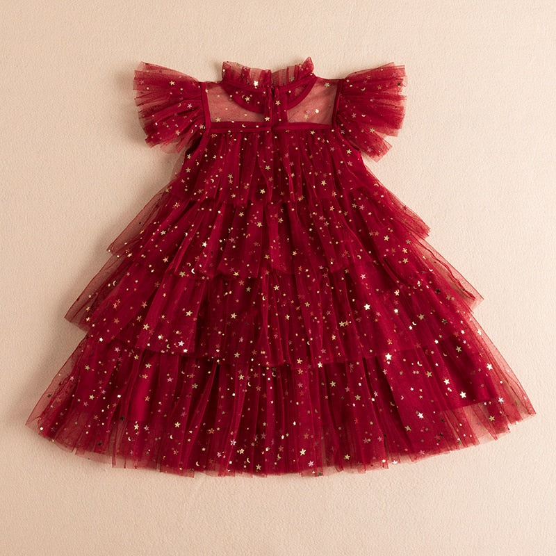 فستان حفلات للأطفال مع كشكشة من الدانتيل والنجوم