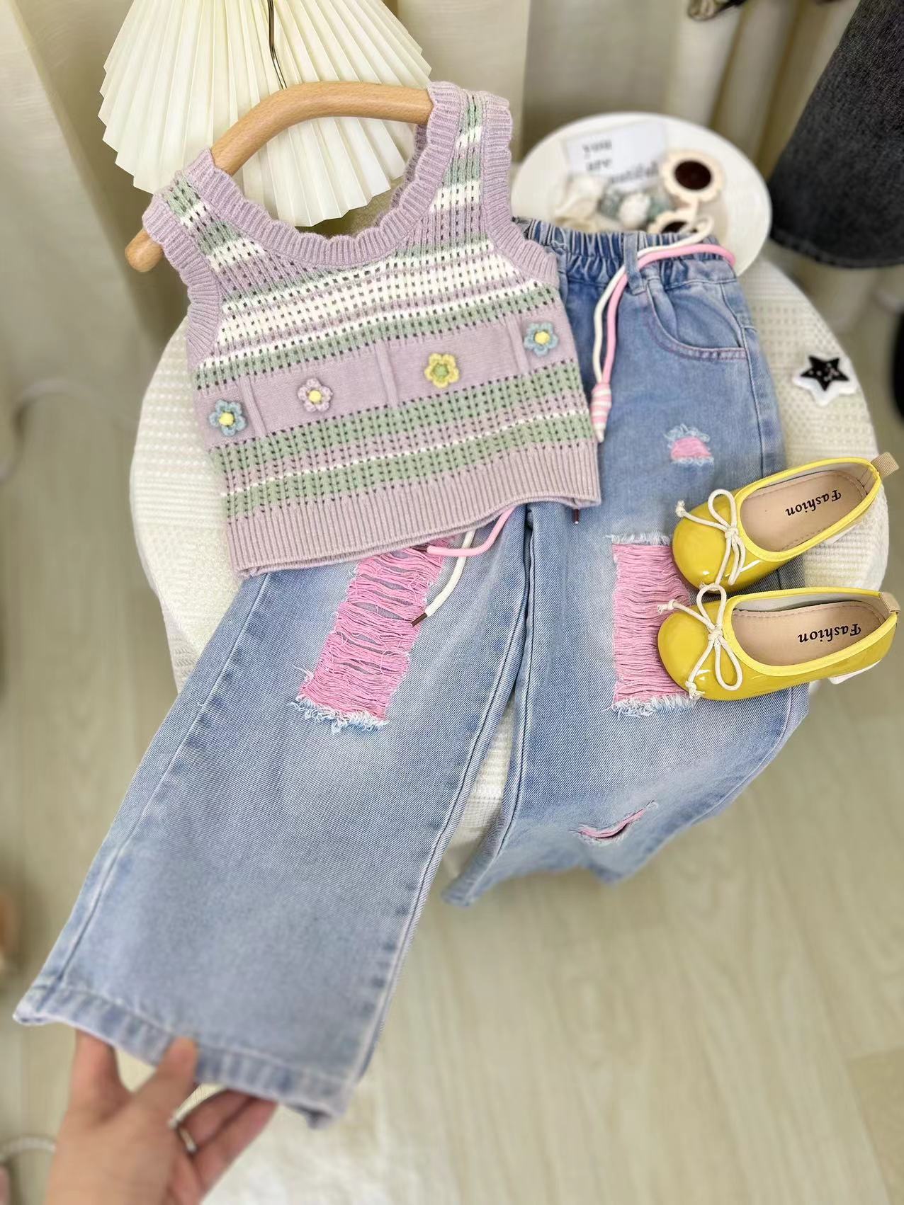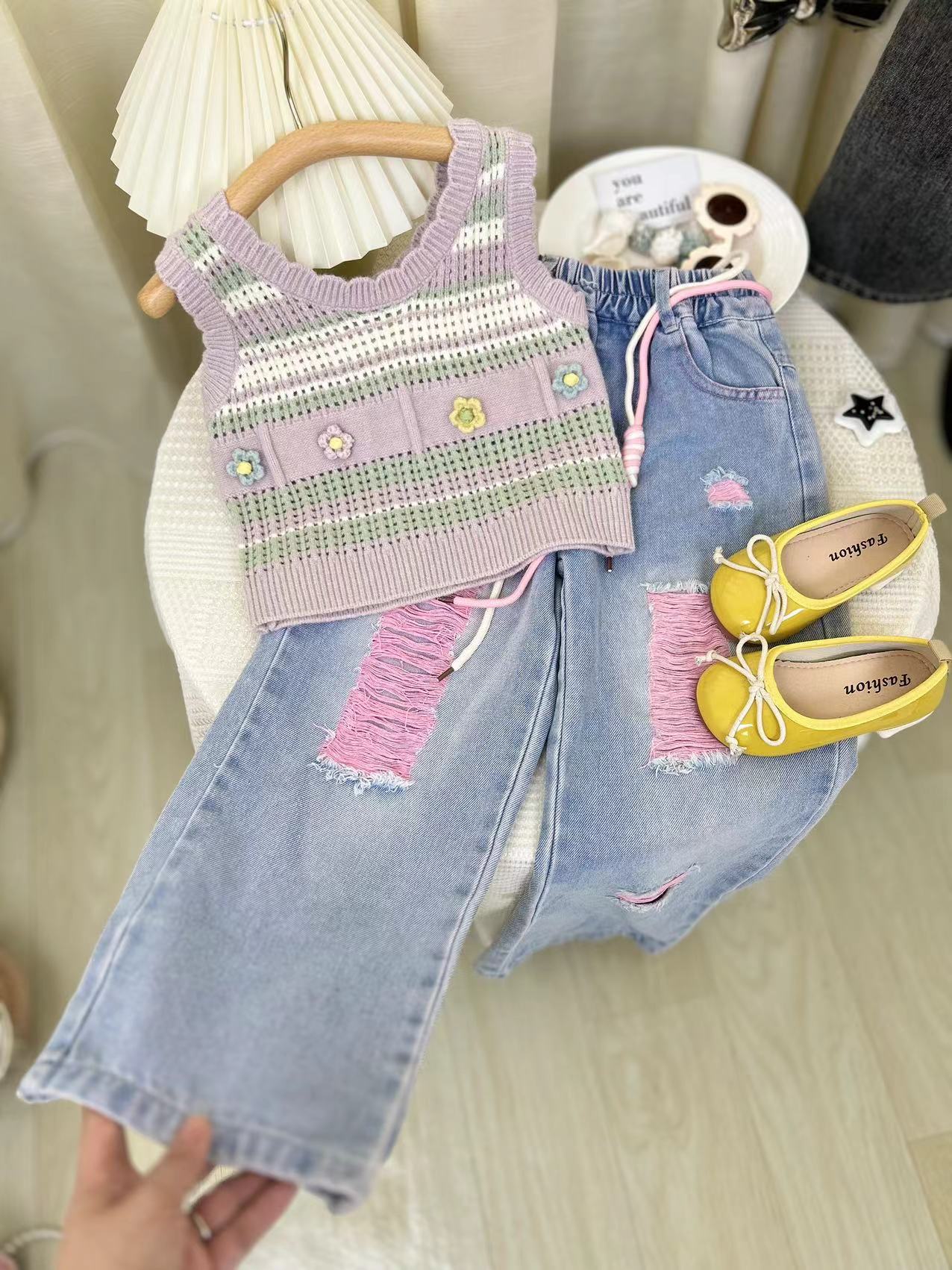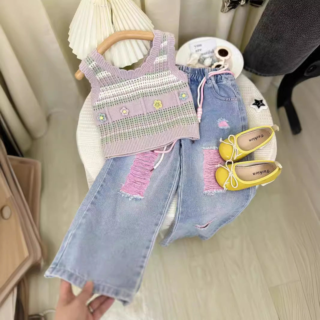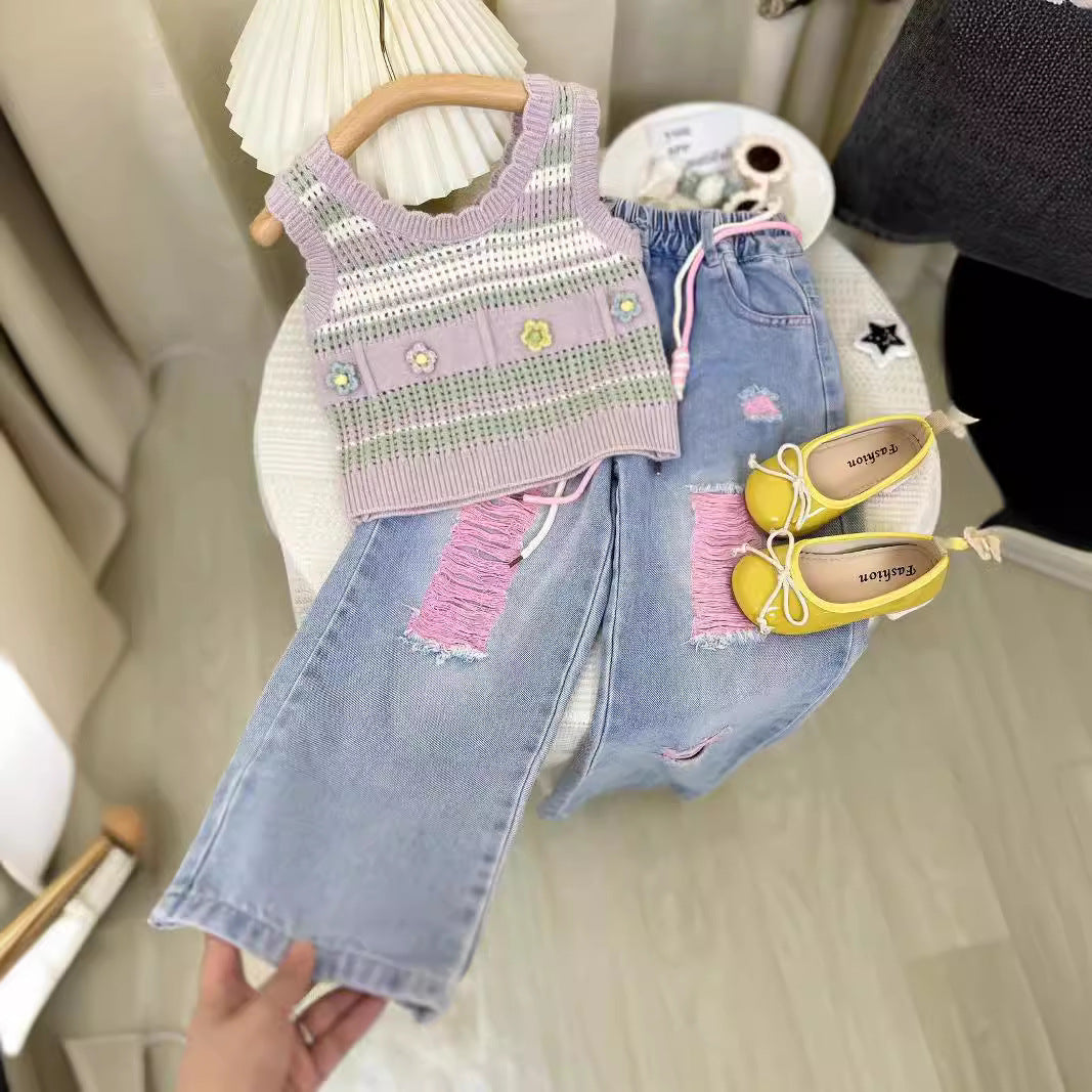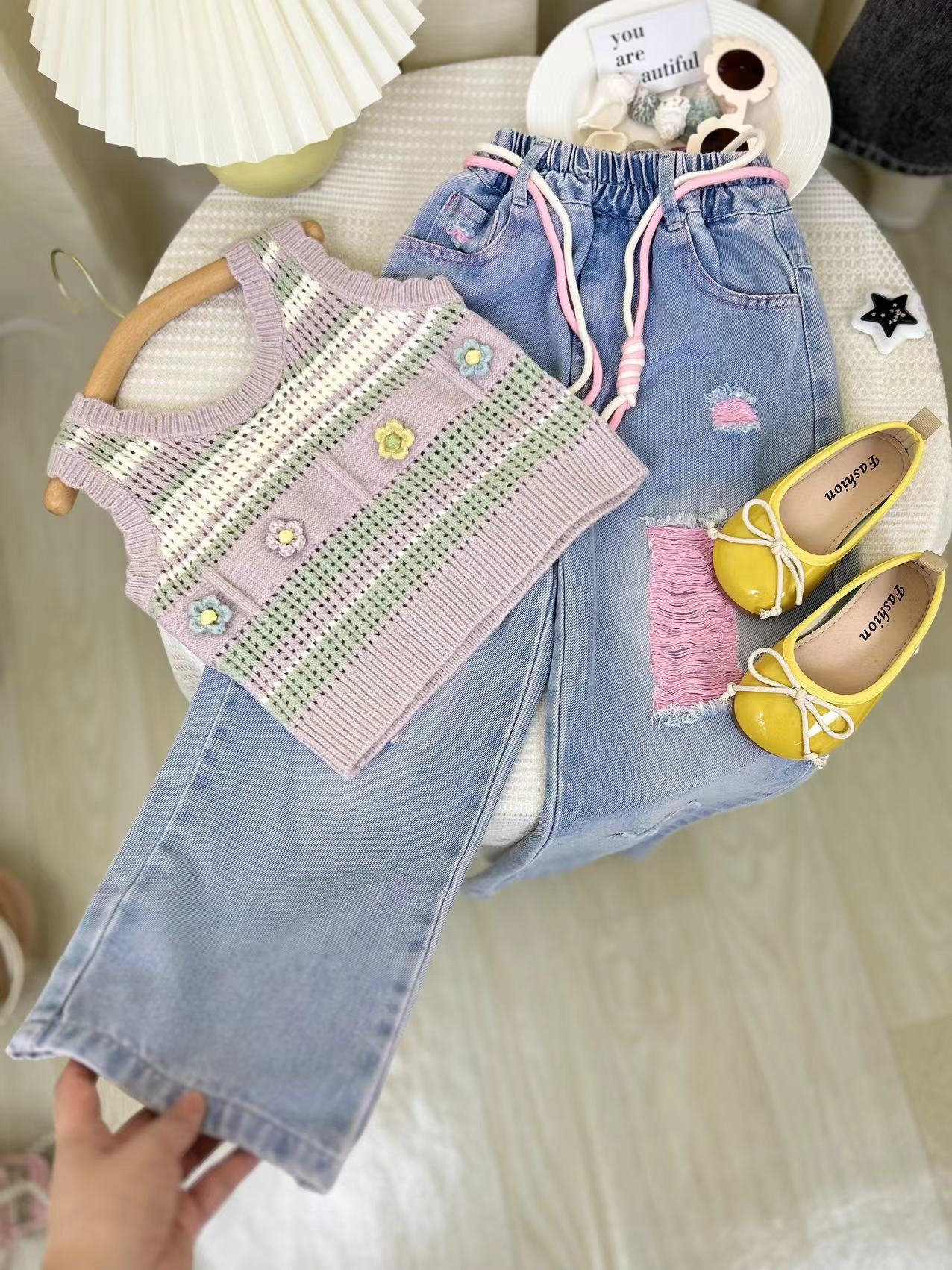 طقم بناتي للأطفال الرضع مزين بالزهور + بنطال جينز