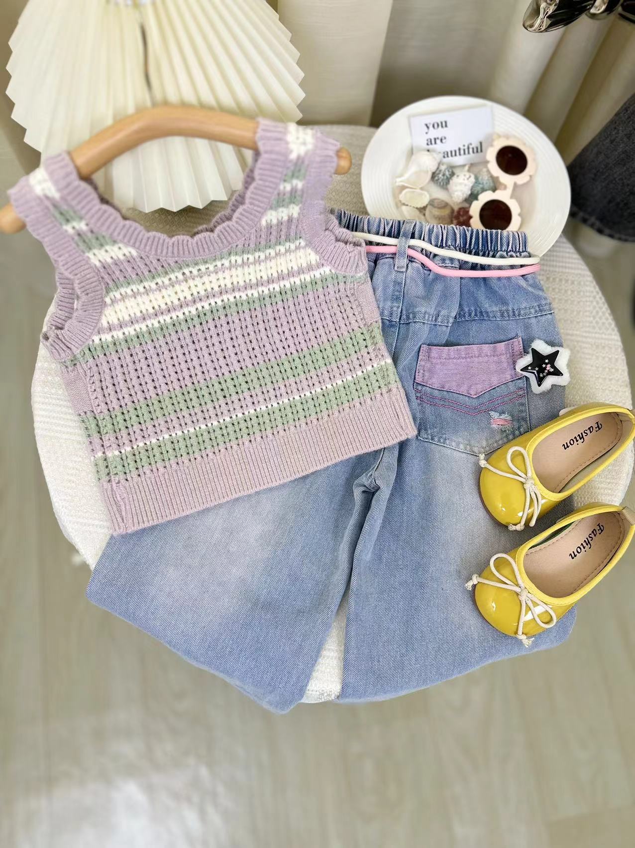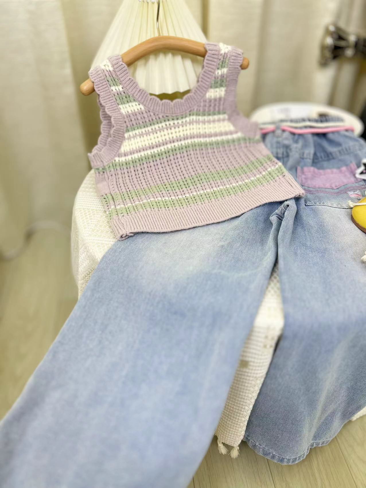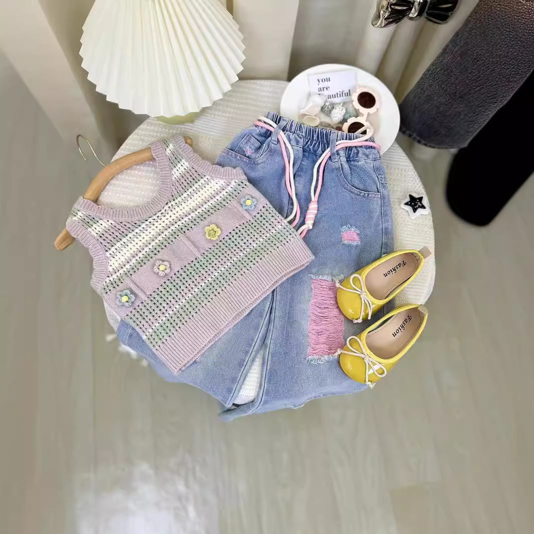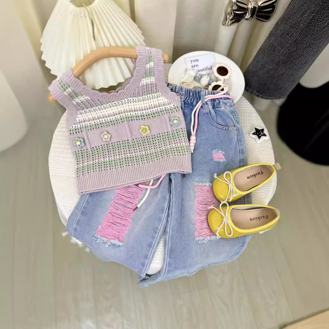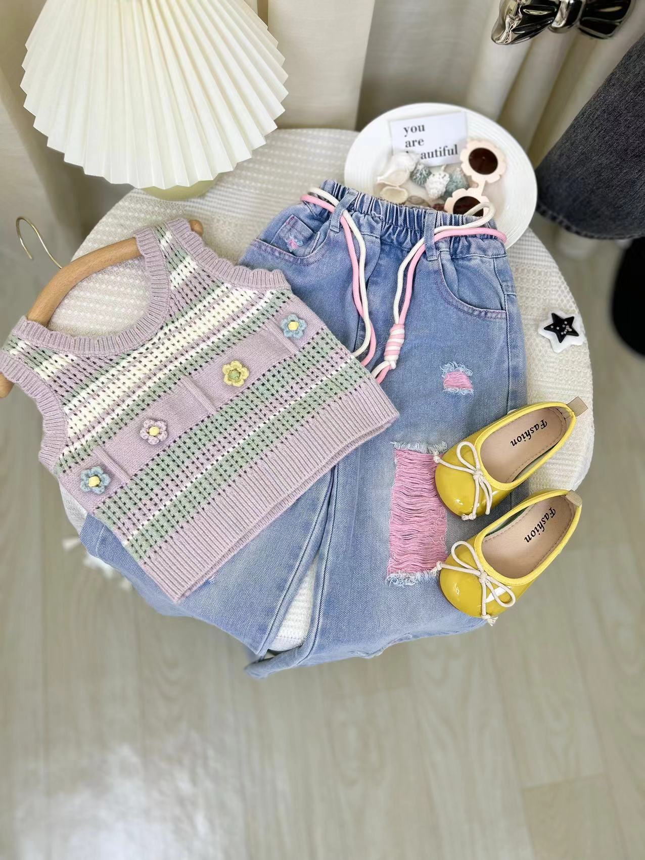 طقم بناتي للأطفال الرضع مزين بالزهور + بنطال جينز
