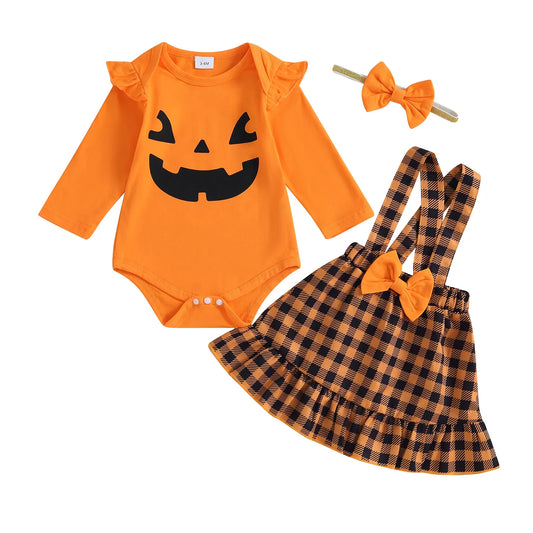 Set Halloween Clothes Cute Long Sleeves Romper and Plaid Suspender