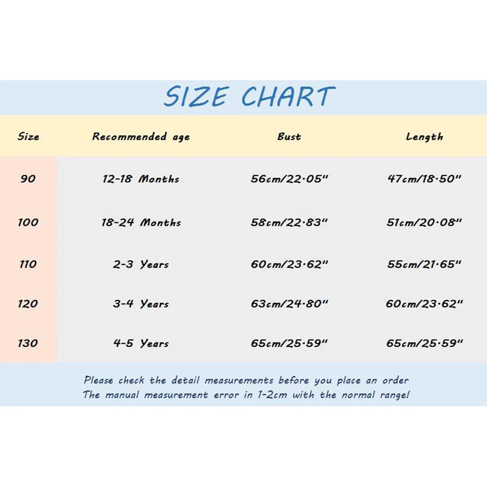 | Size:130 | Recommended age:4-5 Years | Bust:65cm/25.59'' | Length:65cm/25.59'' |
