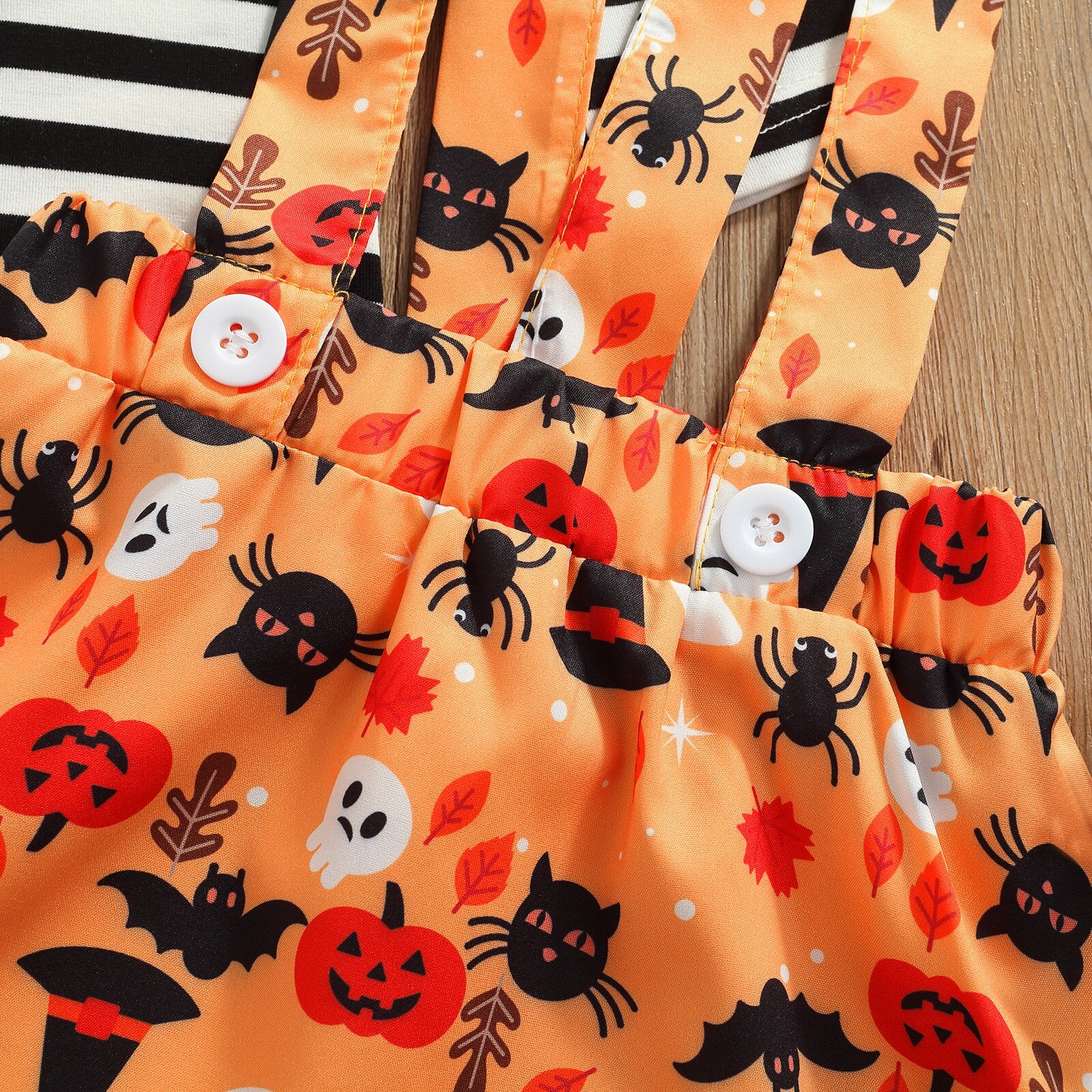 Halloween , Stripe Long Sleeves T-Shirt + Cartoon Print Suspenders Skirt + Headband for Girls