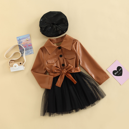 Vestido infantil estilo cuero con falda de encaje + sombrero