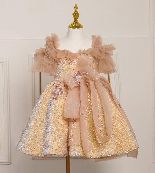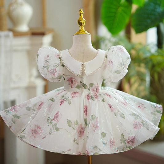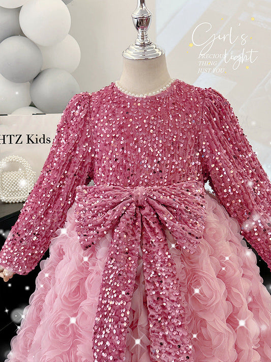 • Vestido de fiesta infantil con flores brillantes y lazo