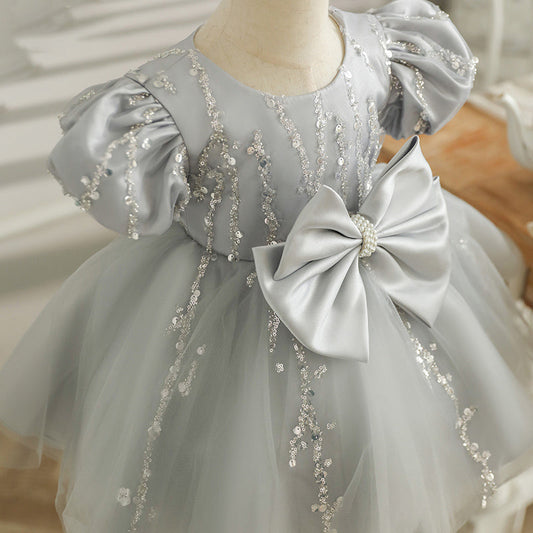 Vestido infantil plateado brillante con lazo