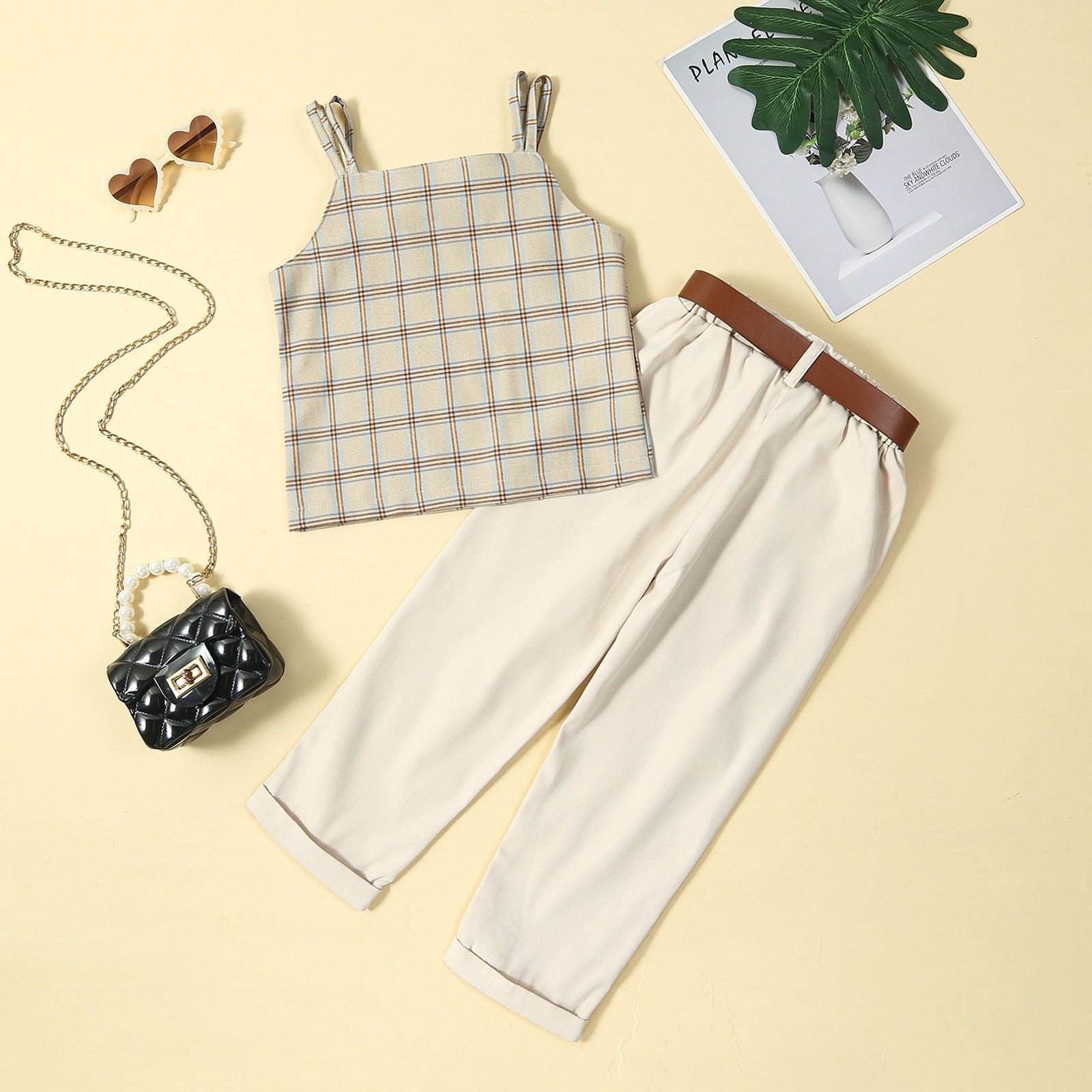 2-Piece Set Plaid Sleeveless Top and Stretchy Pants with Belt Set