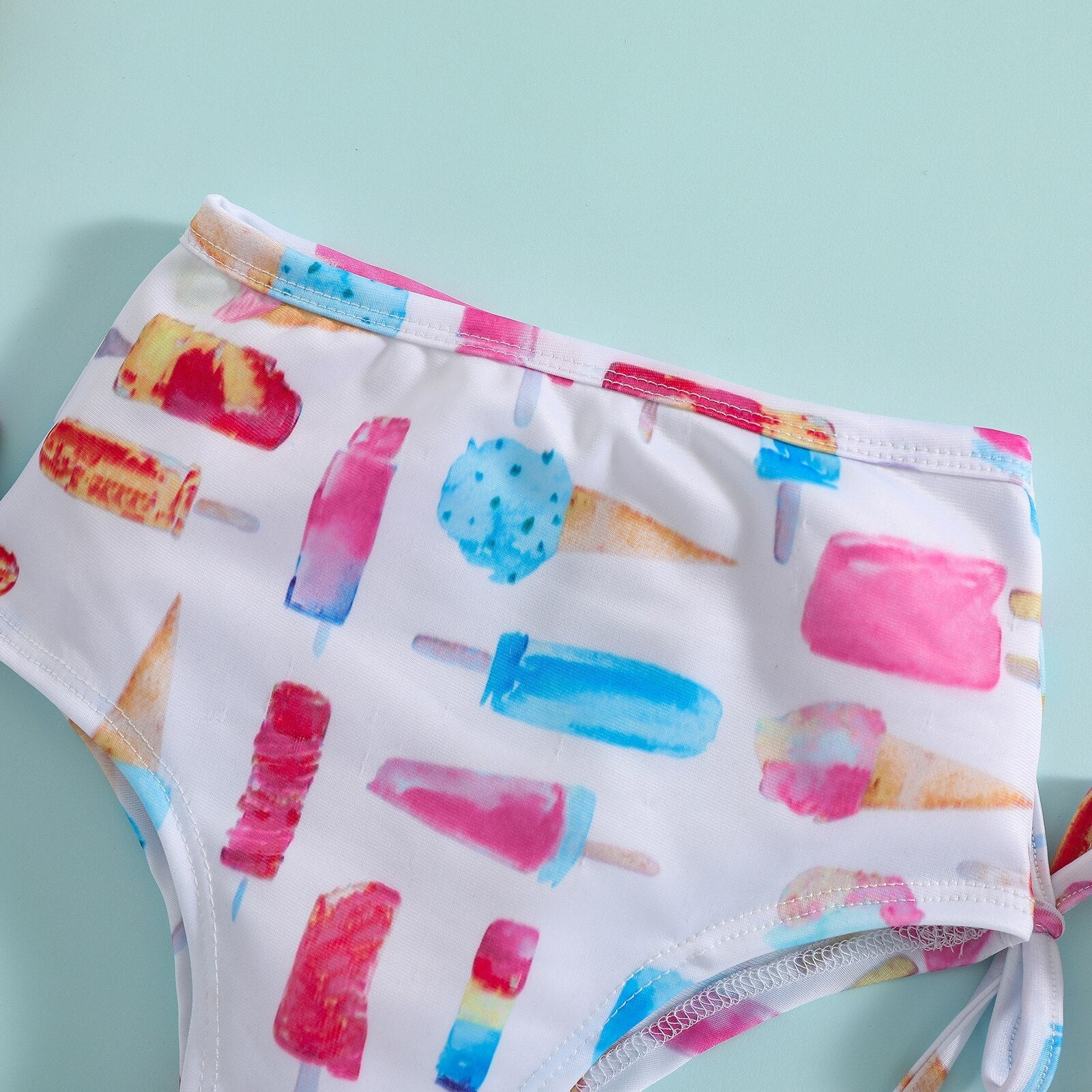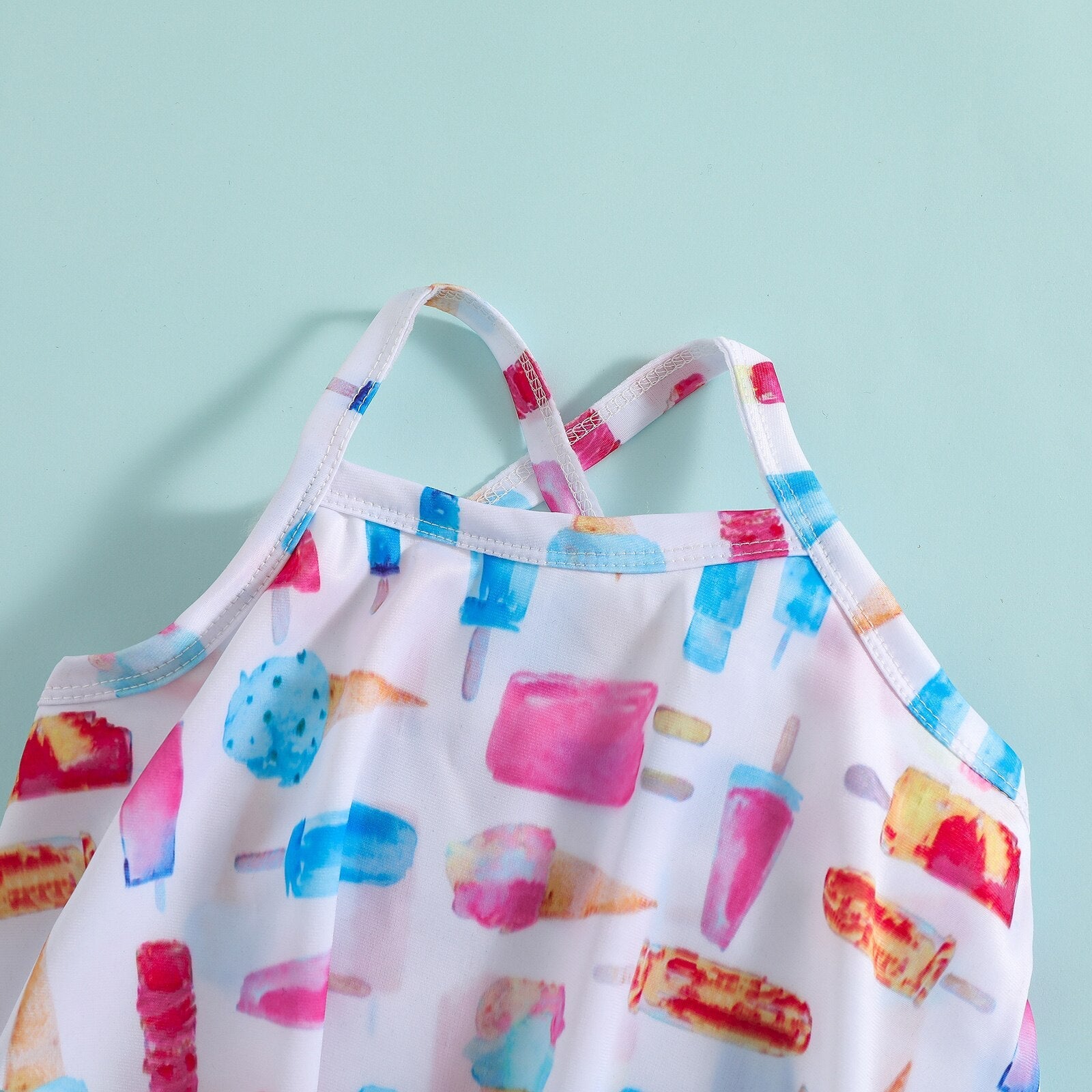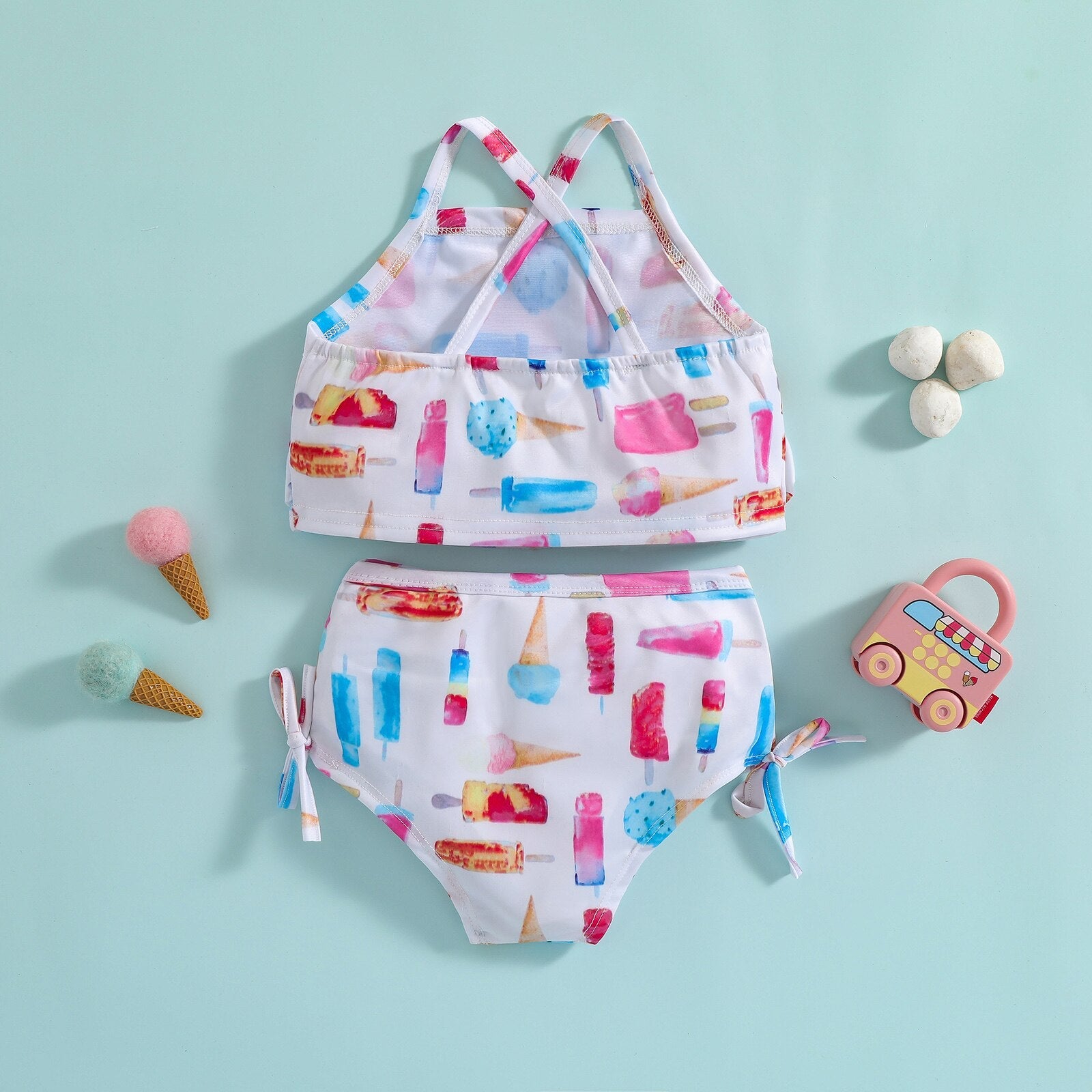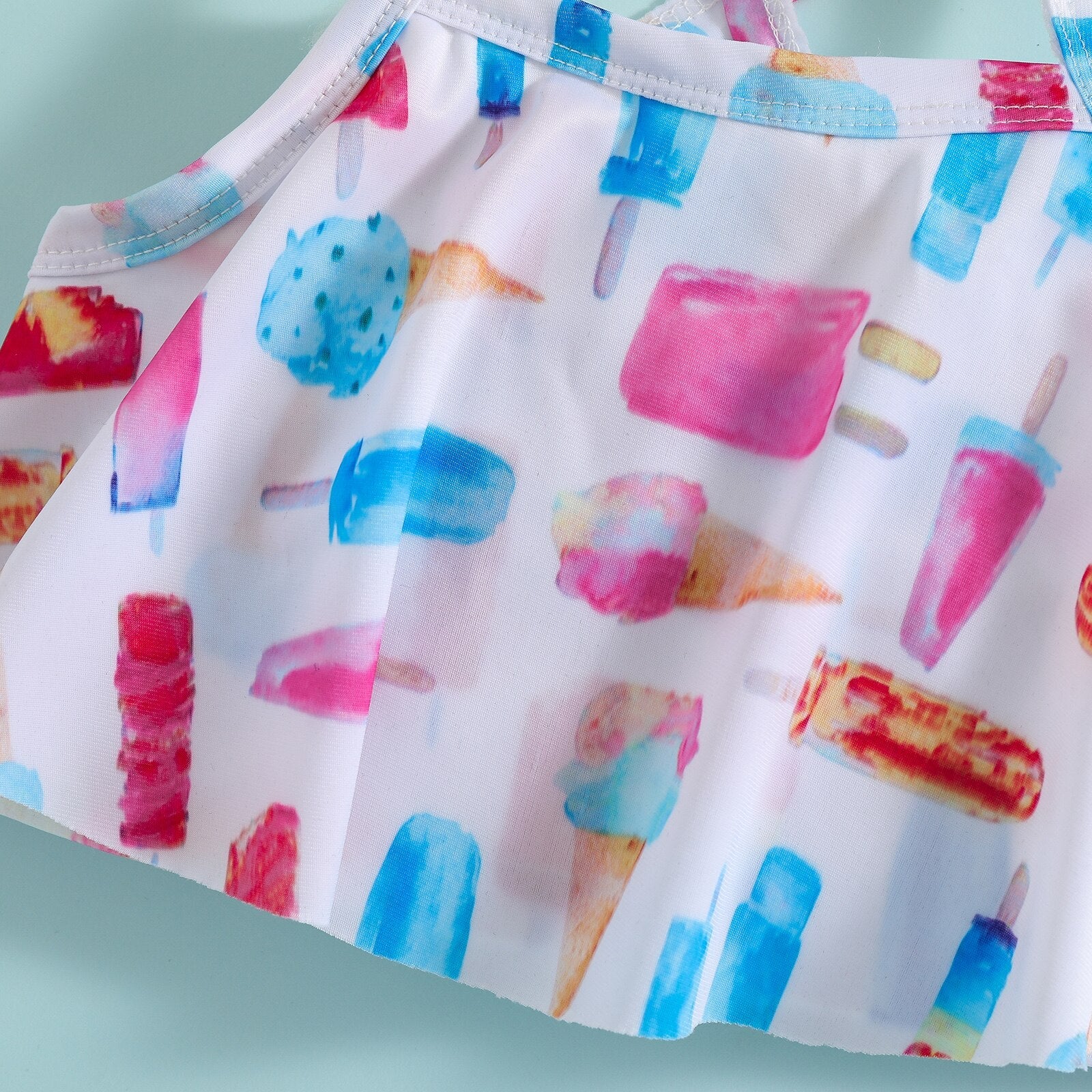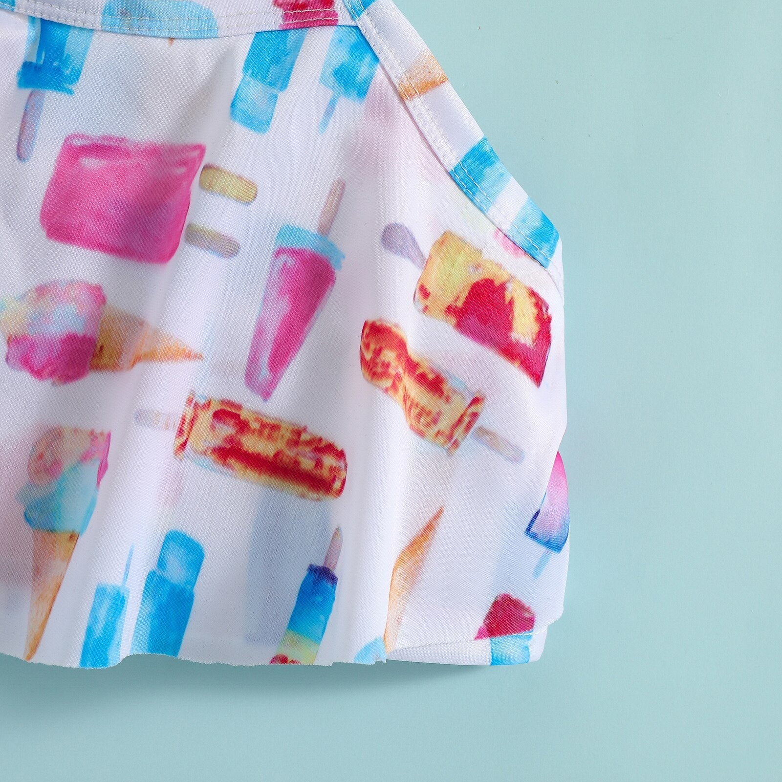 2 Pieces Kids Bathing Suit, Ice Cream Print Sleeveless Crop Tops+ Panties for Girls, White