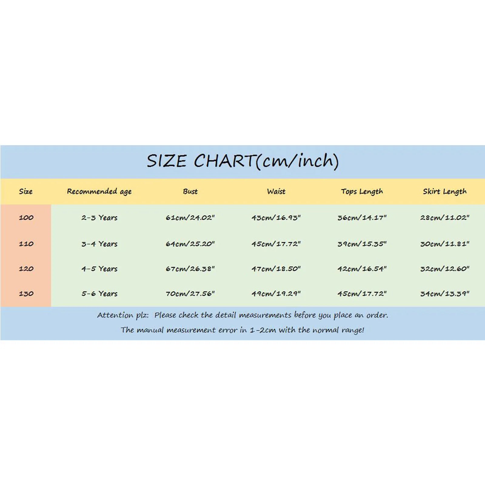 | Size:110 | Recommended age:3-4 Years | Bust:64cm/25.20'' | Waist:45cm/17.72'' | Tops Length:39cm/15.35'' | Skirt Length:30cm/11.81'' |